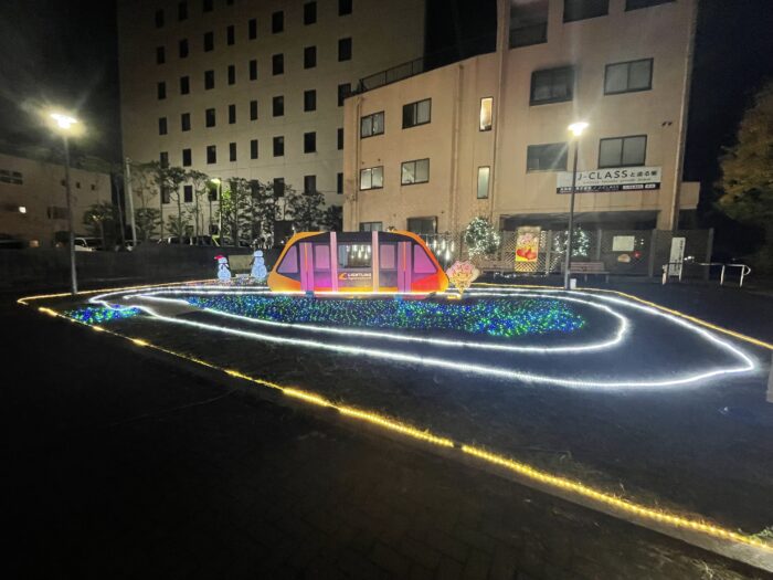 点灯会場では来年夏に開業予定のLRTをテーマにしたイルミネーションなど多くの光で彩られています。