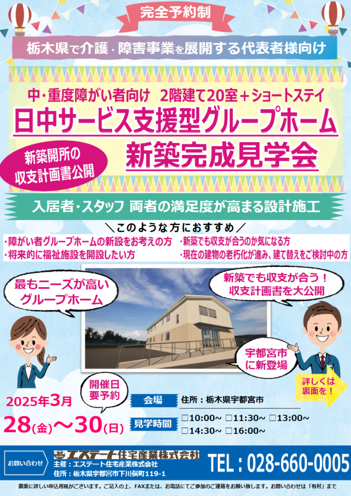 イベント2025.03.28【企画事業部】日中サービス支援型グループホーム完成見学会開催について本日より3日間宇都宮市にて日中サービス支援グループホーム完成見学会を実施いたします。 皆様のご来場お待ちしております。 〇開催概要 ・日時:3/28~3/30 10:00~17:00 ・開催場所:栃木県宇都宮市西川田3丁目15番1号 ・お問い合わ...