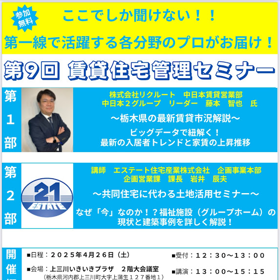 イベント2025.04.23【満室の窓口】第9回賃貸住宅管理セミナー開催のお知らせ賃貸経営セミナー「第9回 賃貸住宅管理セミナー」開催のお知らせ 【開催場所】 上三川いきいきプラザ 2階大会議室東 【開催日時】 4月26日(土)13:00~15:15 【所在地】 〒329-0617 栃木県河内郡上三川町上蒲生127-1 【定員】 20名(完...