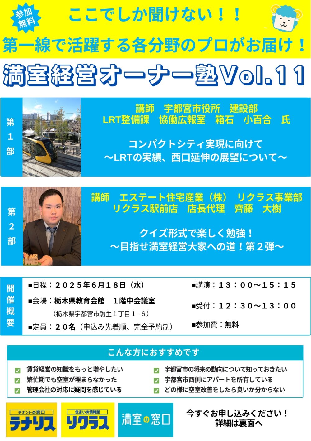 イベント2025.05.16【満室の窓口】賃貸経営セミナー「満室経営オーナー塾Vol.11」開催のお知らせ賃貸経営セミナー「満室経営オーナー塾Vol.11」開催のお知らせ 【開催場所】 栃木県教育会館 1階中会議室 【所在地】 〒320-0066 栃木県宇都宮市駒生1丁目1ー6 【日時】 6月18日(水)13:00〜15:15(12:30〜受付開始) 【定員】 2...