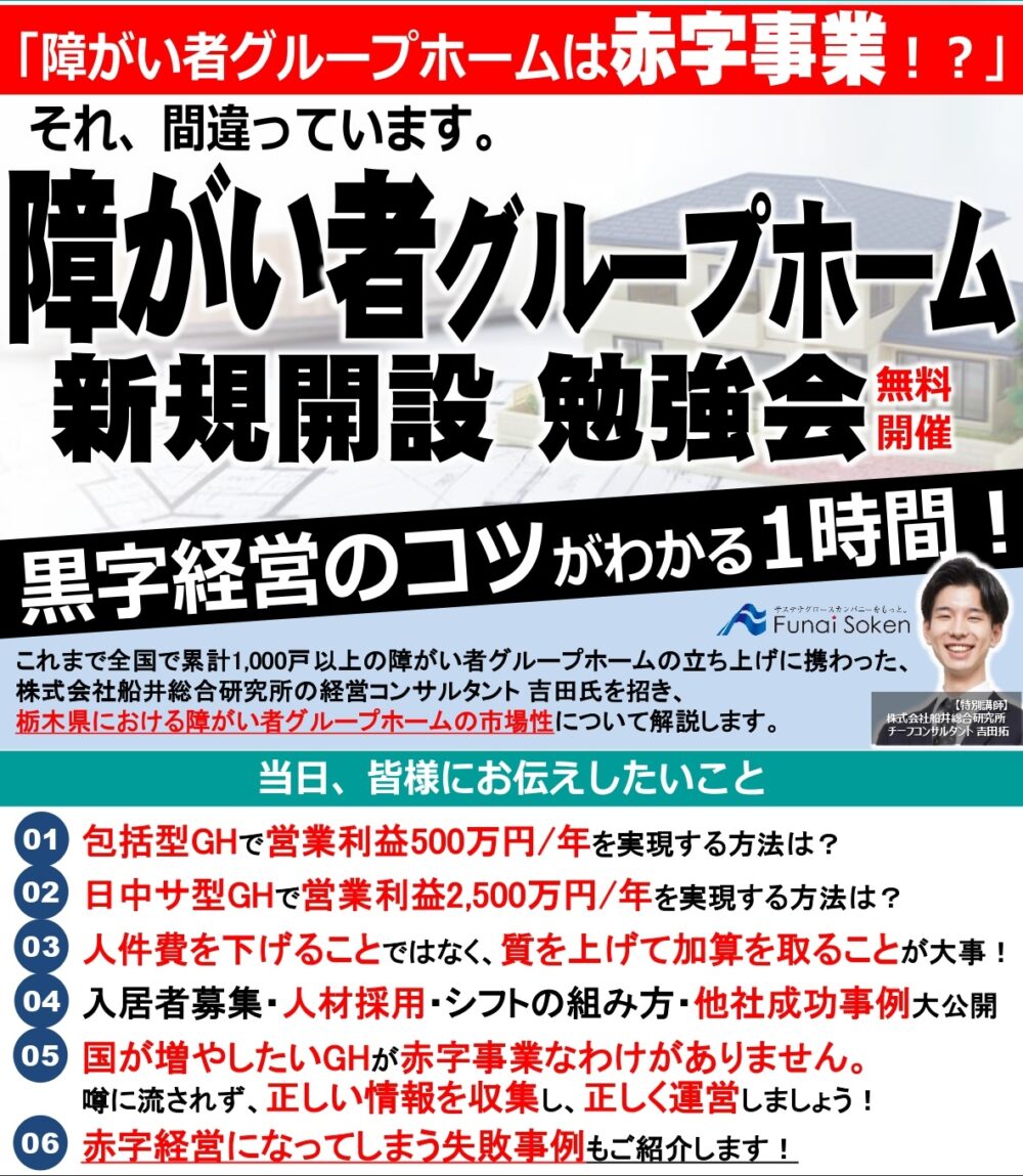イベント2025.07.04【企画事業部】障がい者グループホーム黒字経営勉強会開催のお知らせ障がい者グループホーム新規開設勉強会を開催いたします。 《障がい者GH新規開設勉強会》 ・日時:7/25(金)14:00~15;00(13;30受付開始) ・開催場所:栃木県青年会館コンセーレ カトレアルーム(宇都宮市駒生1-1-6) ・講師:船井総研 吉田様...