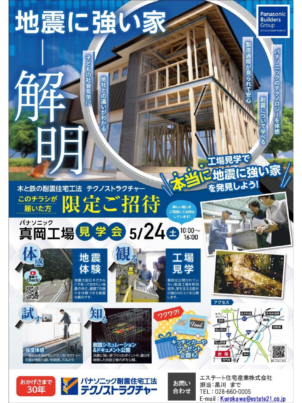 イベント2025.05.20【住宅課】木と鉄の耐震工法 テクノストラクチャーの工場見学を開催5月24日(土)に”木と鉄の耐震工法” 「テクノストラクチャーの工場見学」を開催いたします。 【イベント概要】 ①工場の見学②強度体験③施工体験④セミナー⑤地震体験 ⑥キッチンカーなど色々なイベントをご用意しております。 住宅を検討している社員、お知り合い、ご...