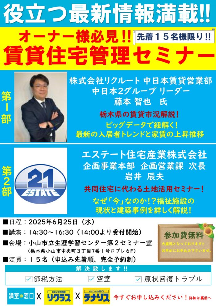 イベント2025.06.13【満室の窓口小山】賃貸住宅管理セミナー賃貸住宅管理セミナー開催のお知らせ 【開催場所】 小山市立生涯学習センター第2セミナー室 【所在地】 〒323-0023 栃木県小山市中央町3丁目7番1号ロブレ6F 【日時】 6月25日(水)14:30〜16:30(14:00〜受付開始) 【定員】 15名(完...