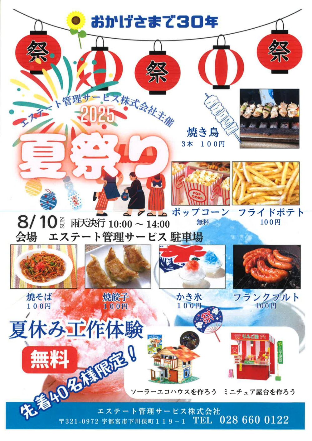 イベント2025.07.25【エステート管理サービス主催】夏祭り開催のお知らせ🌻エステート管理サービス株式会社 夏祭りイベント開催のお知らせ🌻 日頃より地域の皆様には格別のご愛顧を賜り、誠にありがとうございます。 このたび、皆様への感謝の気持ちを込めて、夏祭りイベントを開催いたします! お子様の夏休みの宿...