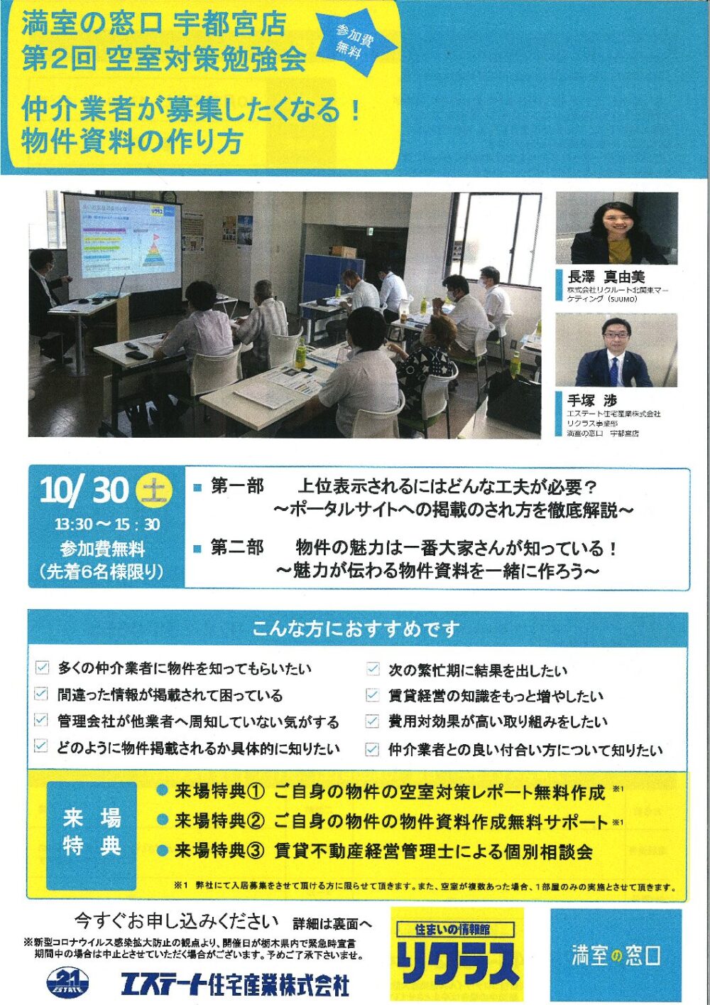 イベント2021.10.12【満室の窓口】第2回オーナー様向け勉強会開催のお知らせ前回大変ご好評頂きました、満室の窓口オーナー様向け勉強会の再開催が決定いたしました! 【満室の窓口】第2回オーナー様向け勉強会 ☆仲介業者が募集したくなる!物件資料の作り方☆ 日程:10月30日(土)13...