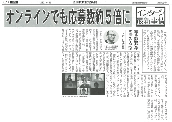 採用情報2020.10.12全国賃貸住宅新聞へ掲載されました2020.10.12発刊 全国賃貸住宅新聞へ弊社が掲載されました! インターンシップ特集記事で弊社のオンラインインターンシップへの 取り組みや実施事例等が掲載されております。 ぜひご覧ください。 採用情報...